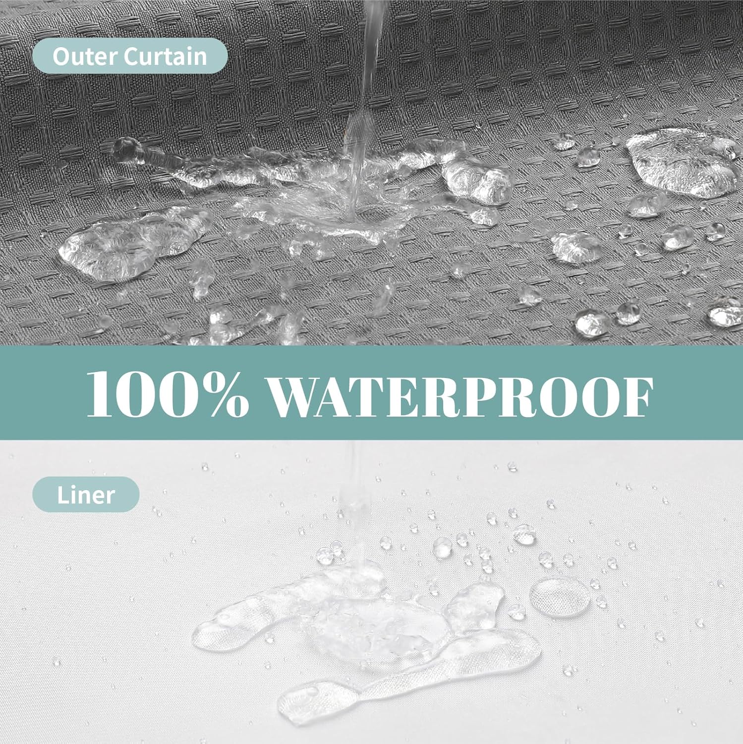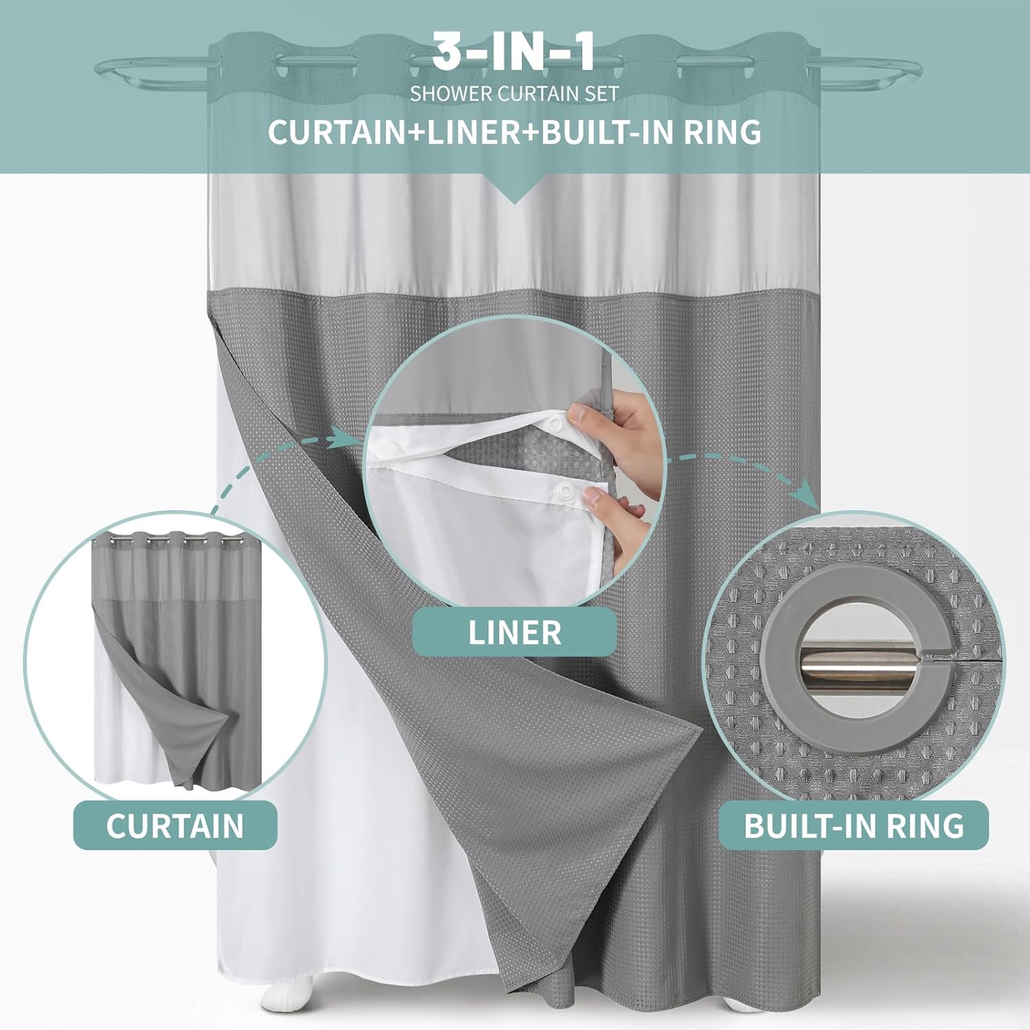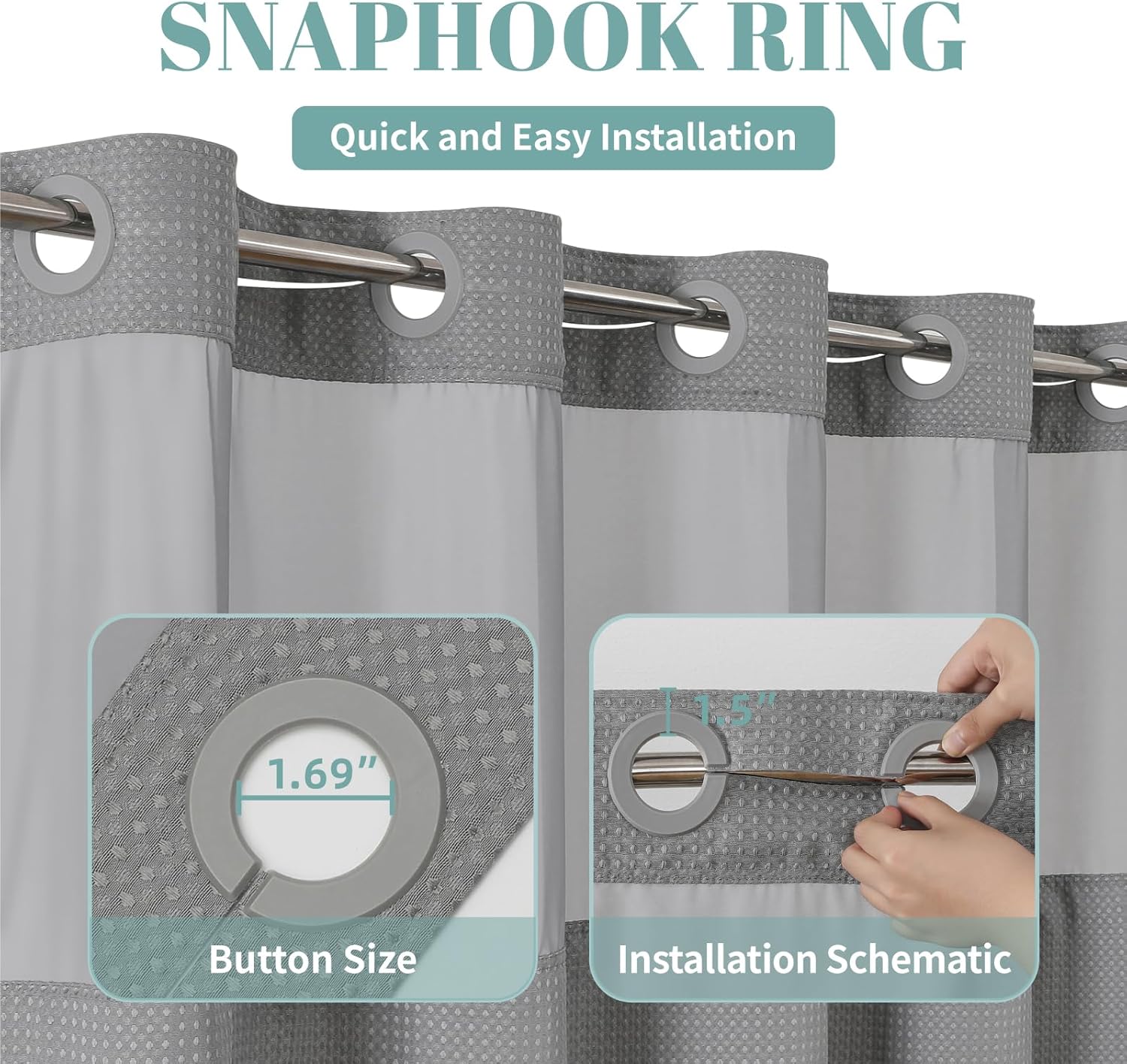 Grey No Hook Waffle Weave Shower Curtain with snap-in Liner Replacement, 230GSM Waterproof Fabric Hotel Shower Curtain Set for Bathroom, Through Mesh Top Window,71Wx74H