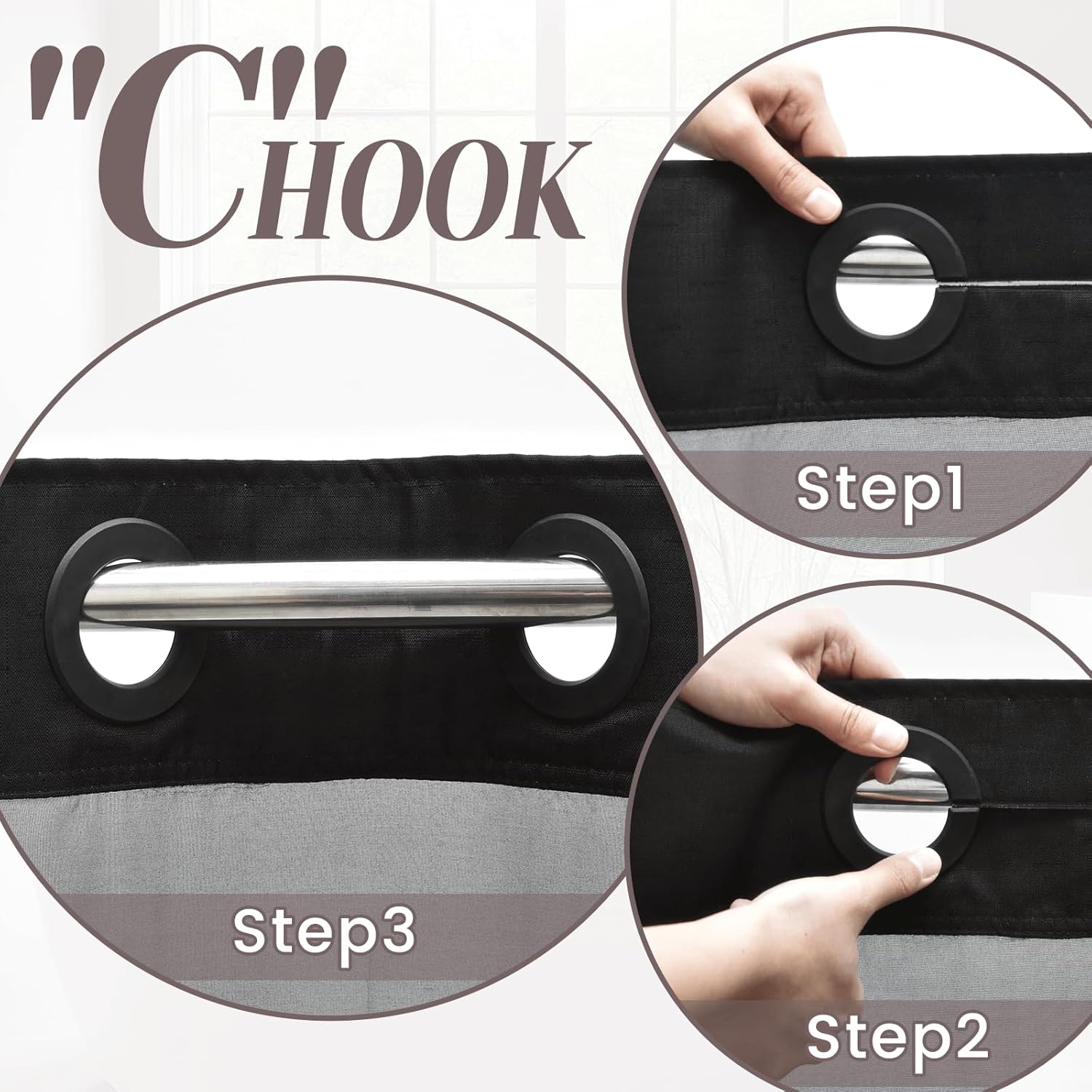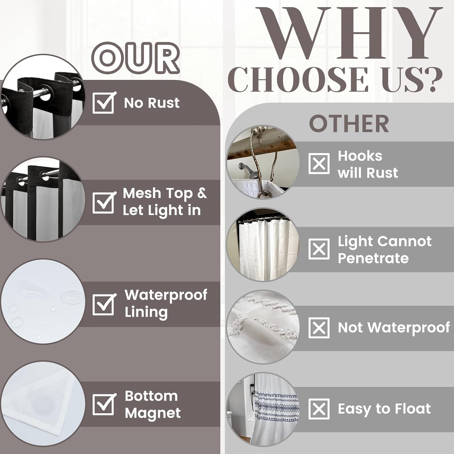 No Hook Slub Textured Shower Curtain with Snap in Liner - Black Fabric Outer Curtain & Waterproof Inner Liner, Hotel Style with See Through Top Window, 71x74 in